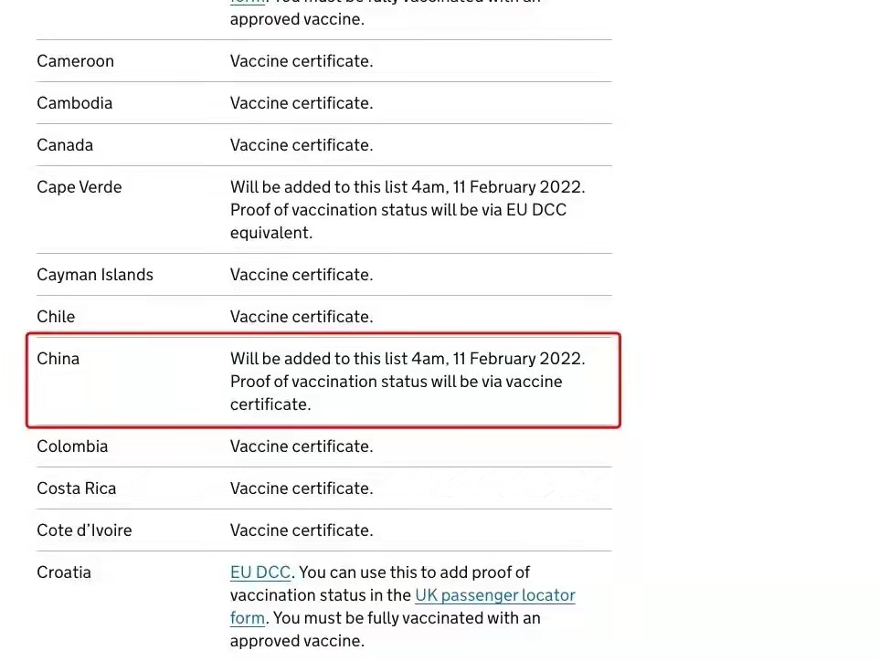 中国被纳入其认可的国家与地区名单,在抵英前14天完成了全程疫苗接种的中国旅客,入境英格兰后无需检测。