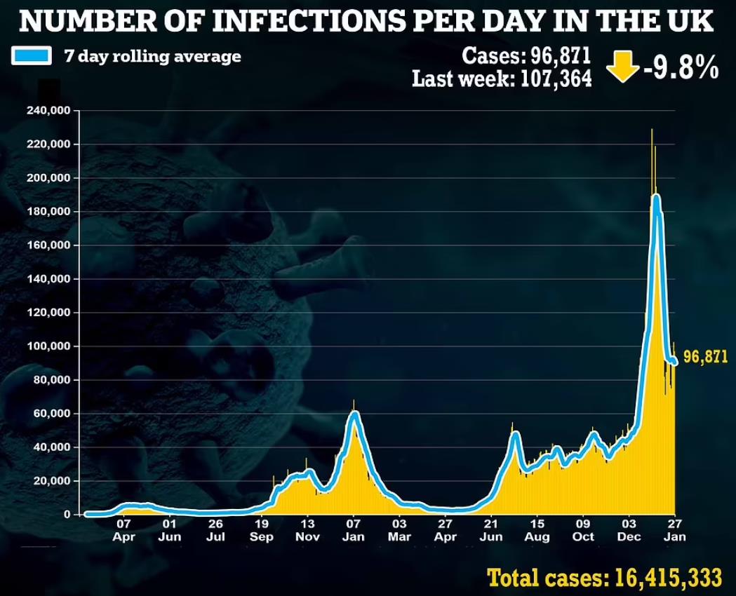 官方数据显示,本周四,英国新增确诊96,871例,同比下降9.8%。
