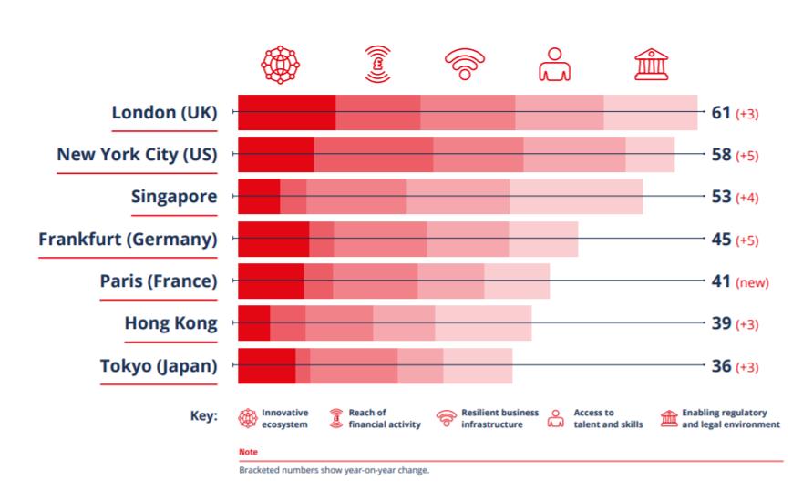 报告发现,伦敦具有世界上最具创新性的金融和专业服务生态系统,在该指标的得分名列前茅(64分)。