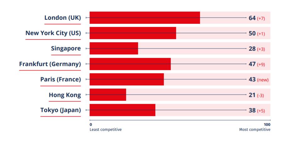 结果显示,伦敦的整体竞争力得分为61分,其次是纽约(58分)和新加坡(53分),巴黎的得分为41分,香港和东京的得分分别为39分和36分。