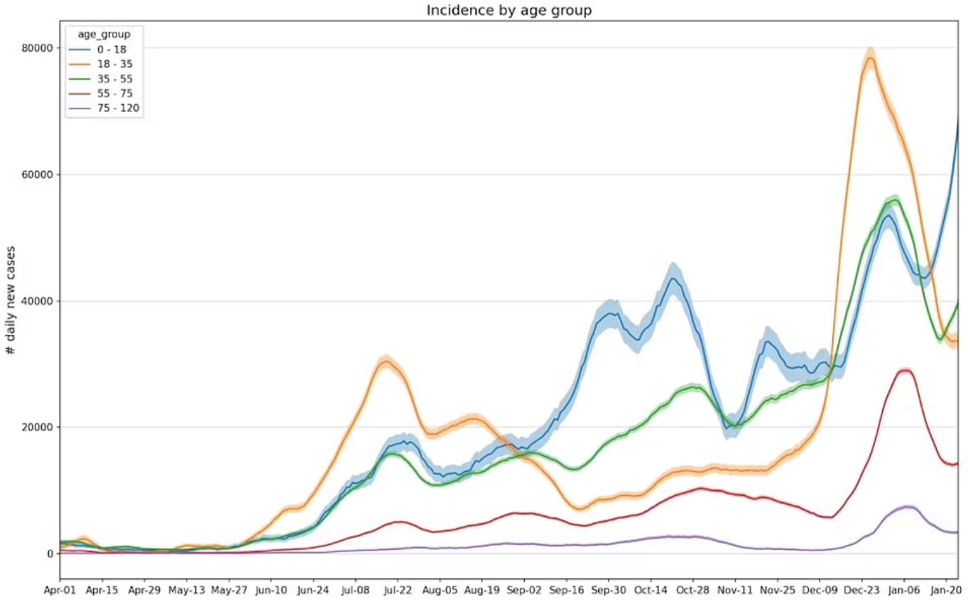 目前,在9岁以下的儿童中,每11人就有1人确诊(8.8%),而在30至39岁的人群中,每21人中有1人感染(4.6%)。与此同时,10至19岁的人群中有4.4%的人有新冠症状,而20多岁和40多岁的成年人中这一比例为3%。