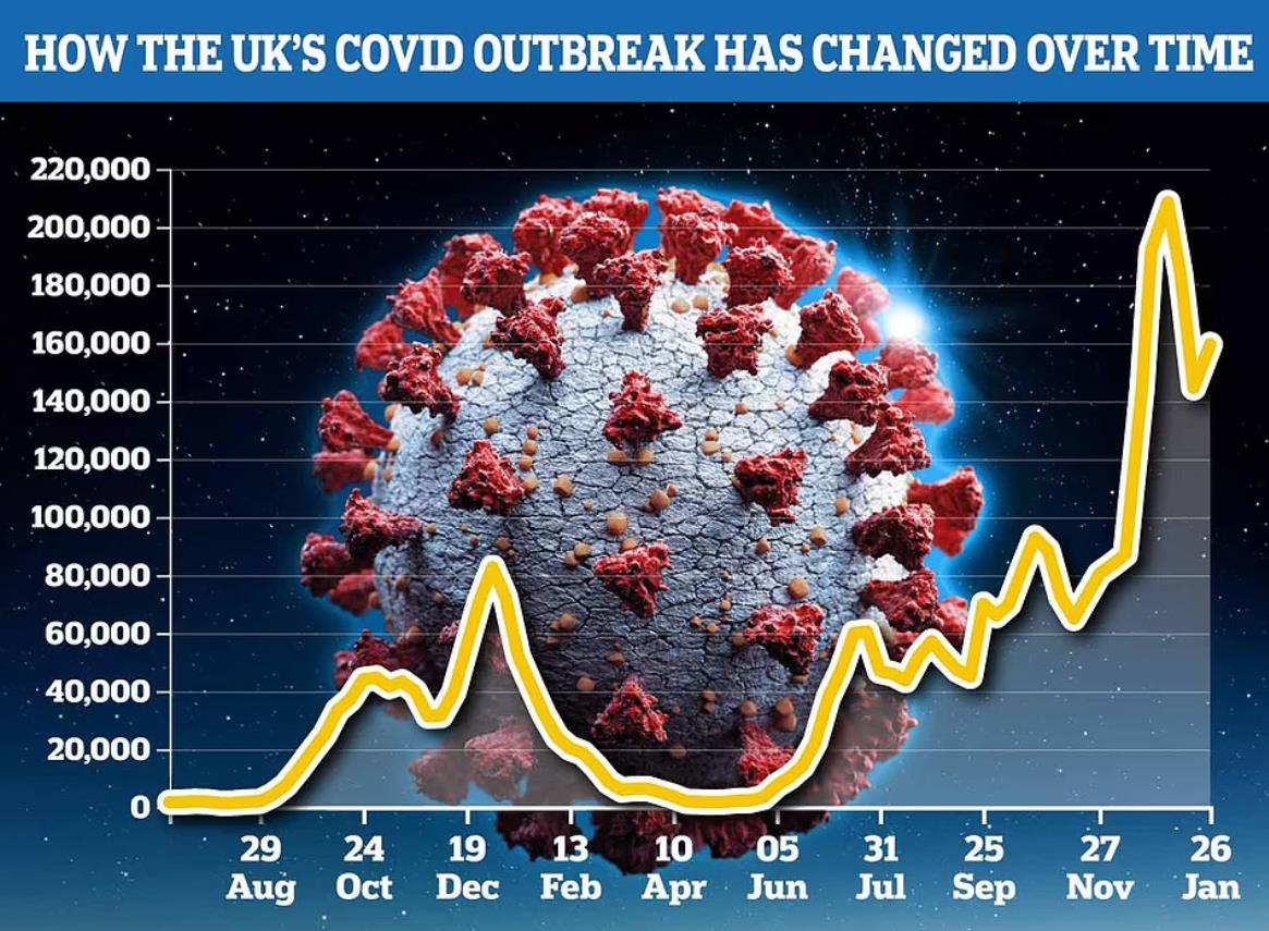 据伦敦国王学院的监测,在截至1月26日的一周内,英国每天有16万人感染新冠,比此前一周的14.5万人上涨10%。专家表示,这主要是学生病例的增加导致的。