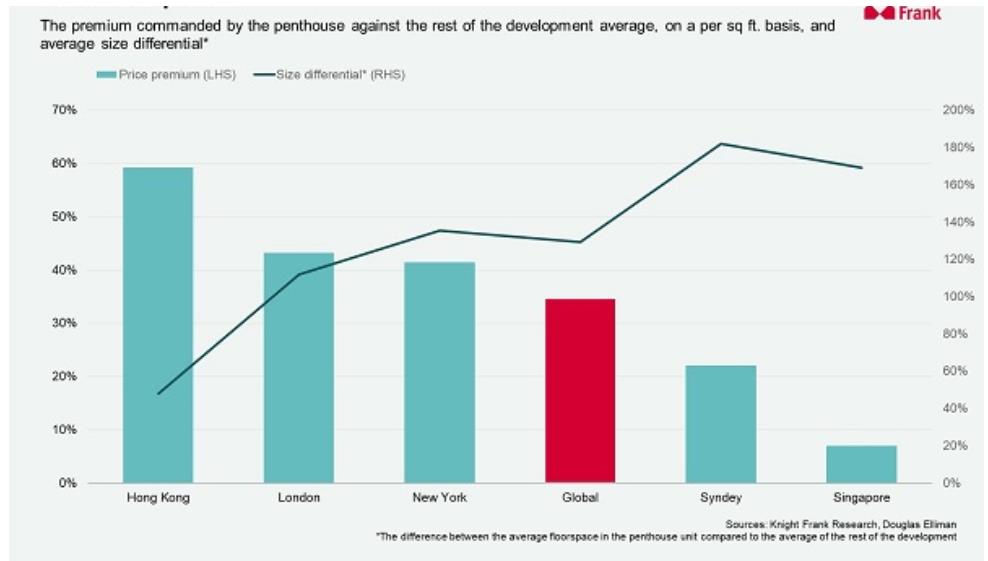 KnightFrank的数据显示,在同一开发项目中,顶层公寓比其他公寓每平方英尺的平均溢价可达35%。