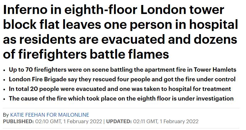 本周一晚,伦敦Tower Hamlets一座大楼突发火灾,尚无严重伤亡…