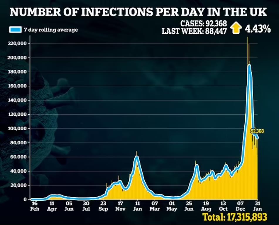 本周一,英国新增确诊92,368例,较上周同比增加4.43%。