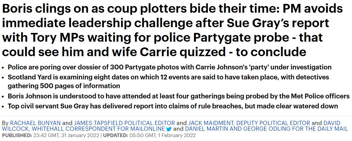 媒体认为,苏·格雷的完整报告和警方调查的结果很可能会再次威胁到鲍里斯的首相职位,而且,鲍里斯和他的妻子也面临着警方的讯问。