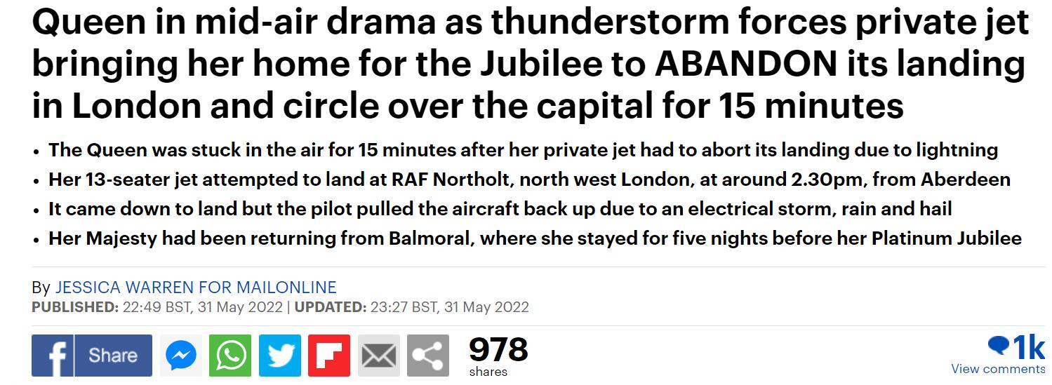 女王的飞机从苏格兰起飞抵达伦敦时,突然遭遇了闪电、雷雨和冰雹的袭击,飞机原本准备降落在伦敦西北部的英国皇家空军诺索尔特机场,但却被迫在空中盘旋了15分钟。