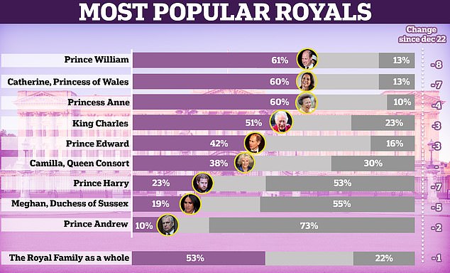 自去年12月22日以来,王位第一继承人威廉王子的支持率下降了8个百分点,哈里和凯特王妃下降了7个百分点。