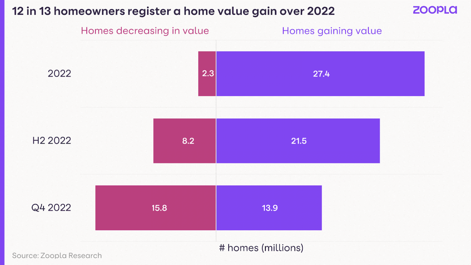 - Zoopla 的数据显示:尽管去年下半年市场动荡,但92%的房主在2022年房屋价值出现上涨,平均资本收益为1.9万英镑。