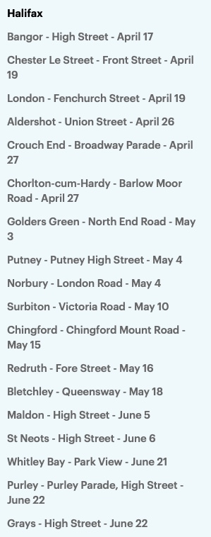 这些分行基本都位于英格兰。18家哈利法克斯银行包括:伦敦北部戈尔德斯格林、马尔登、埃塞克斯和白金汉郡布莱奇利等。