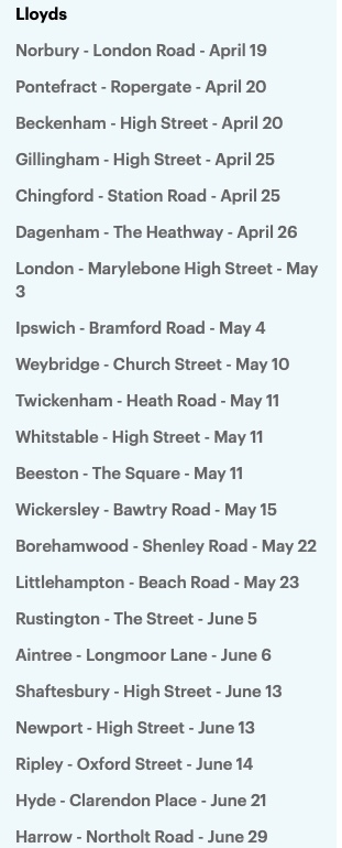22家劳埃德银行包括:伦敦东部的达格纳姆、伊普斯威奇、萨福克、伦敦西南部的特威克纳姆和伦敦西北部的哈罗的支行。