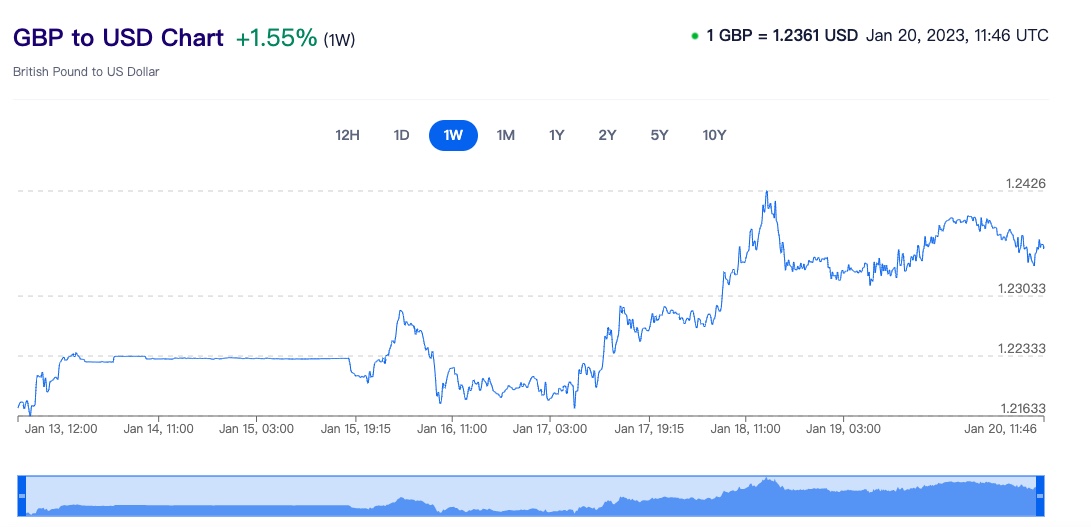 英镑兑美元汇率连续上涨,一周涨幅达1.55%,1 GBP = 1.2361 USD,为去年6月以来的最高水平。