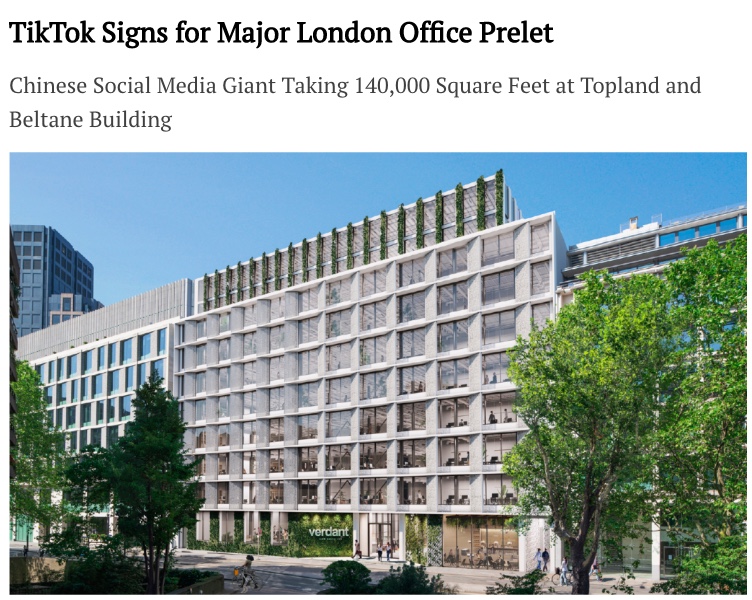抖音与Topland集团和Beltane公司达成协议,预租写字楼作为第三处伦敦办公室。