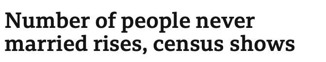 - 英国官方数据显示:从未结过婚或从未有过伴侣关系的人数持续上升。