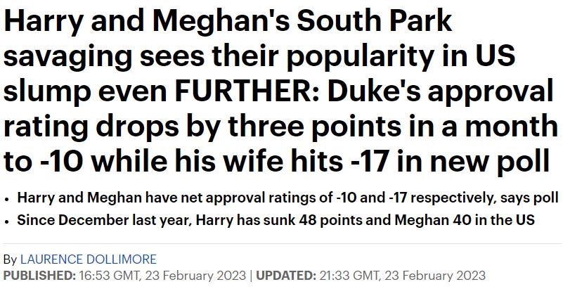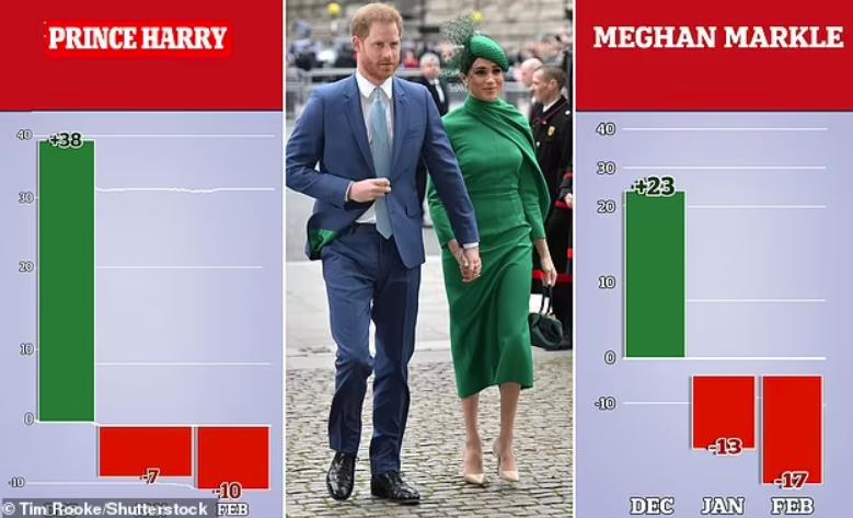 根据 Redfield & Wilton于2月19日进行的 一项调查,自去年12月以来,哈里和梅根的支持率分别下降了48%和40%,目前的净支持率分别为-10%和-17%。