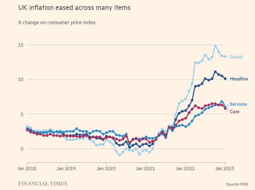 在该调查公布之前,英国已经出现了一系列令人鼓舞的官方数据。英国国家统计局(ONS)上周表示,1 月份总体通胀率从10月份的峰值11.1%下降至10.1%。
