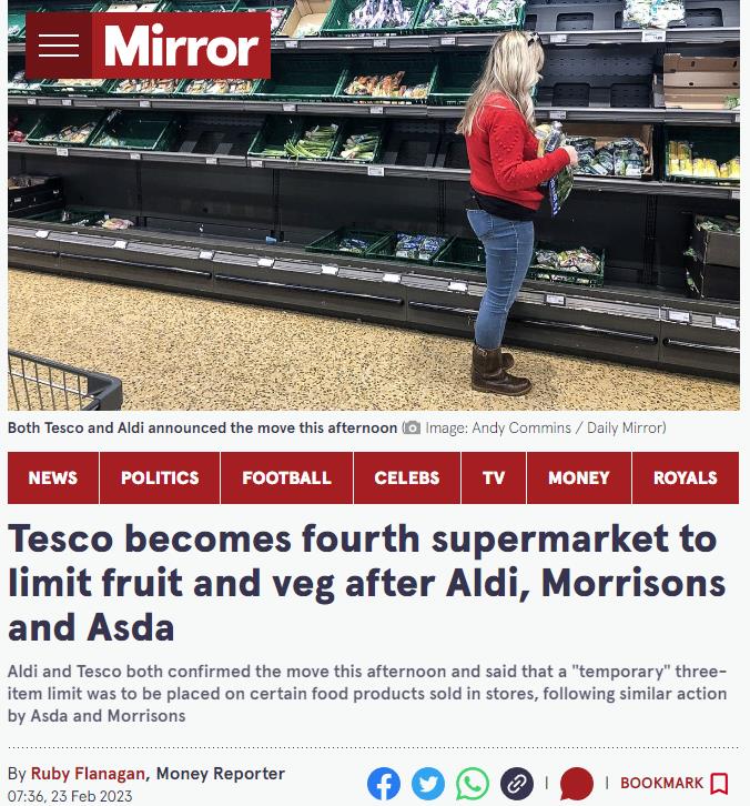 而就在昨天,又有两家连超——Aldi和Tesco也加入了限购,这意味着截至目前,英国已经有四家超市开启蔬果限购。