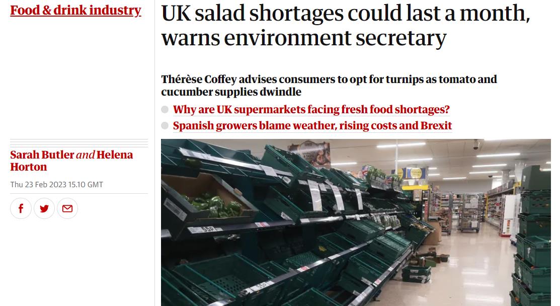 - 英国四家超市开启蔬果限购,英国环境大臣预计短缺最多还将持续一个多月,建议大家吃萝卜代替生菜和西红柿…