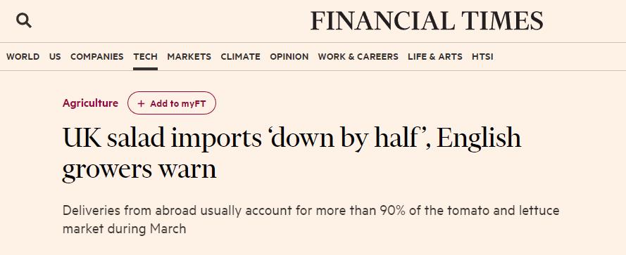 英国零售商协会的数据显示,在2019年,进口番茄占3月份番茄供应量的95%左右,进口生菜占比也高达90%左右。