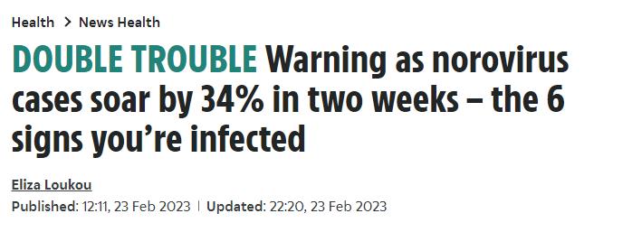 根据英国卫生安全局 (UKHSA) 的数据,在截至2月12日之前的两周内,英国报告了708例诺如病毒感染病例,而在新冠疫情大流行前的两周内,正常时期记录的平均病例数为373 例。