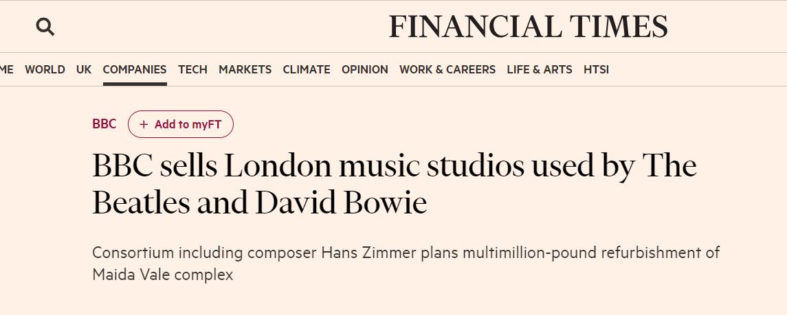 据报道,BBC已成功出售披头士乐队和大卫·鲍伊曾使用过的伦敦音乐工作室Maida Vale Studios,接手的买家是包括奥斯卡获奖作曲家Hans Zimmer在内的财团。