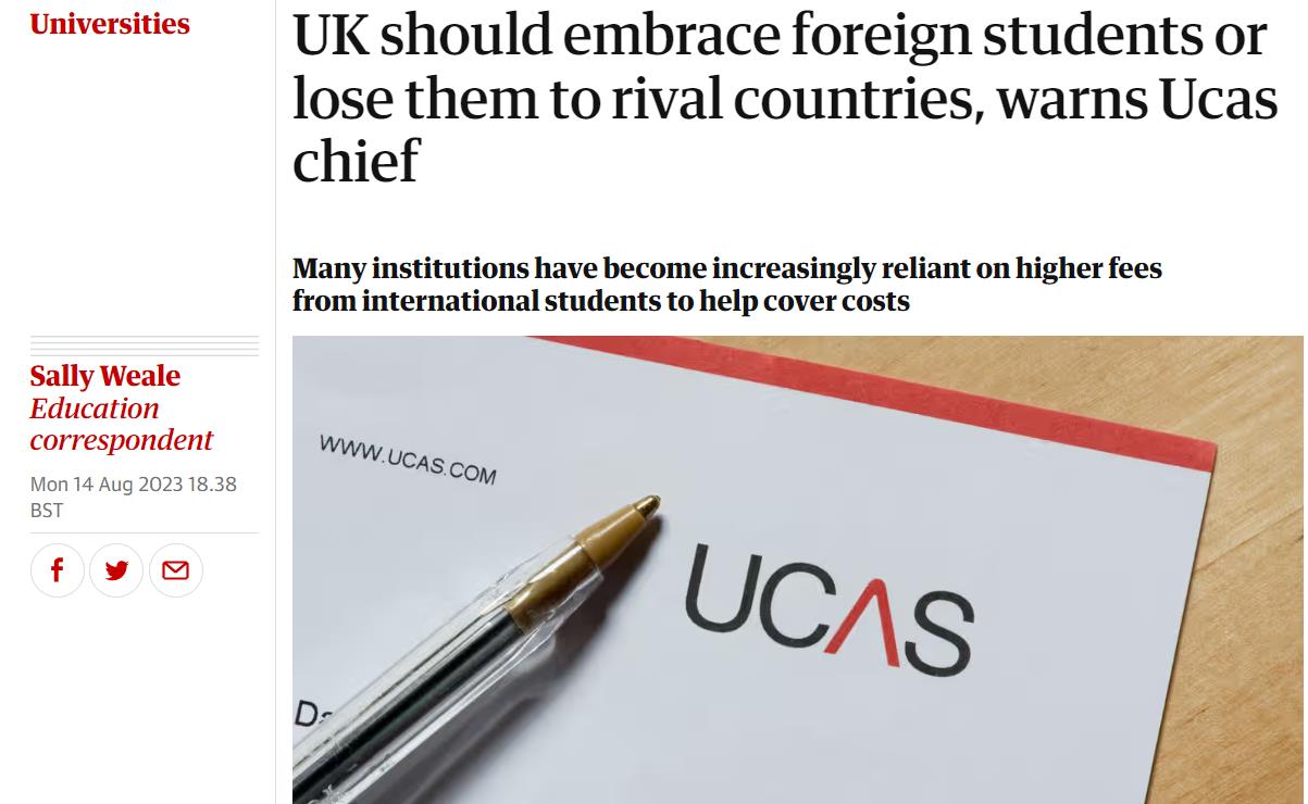 英国高等教育招生办公室(UCAS)负责人表示,英国应该热烈欢迎海外学生加入全国各地的大学,否则就有可能输给竞争对手美国、加拿大和澳大利亚。