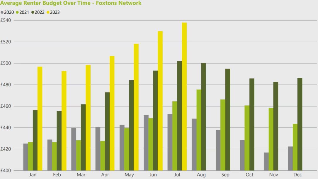 由于租金上涨,自4月份以来,租房申请人的预算环比增长了2%,并且这一趋势一直持续到7月份。Foxton的数据显示,到目前为止,租户预算高于往年,较2022年以来增加了7%。