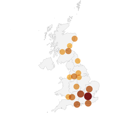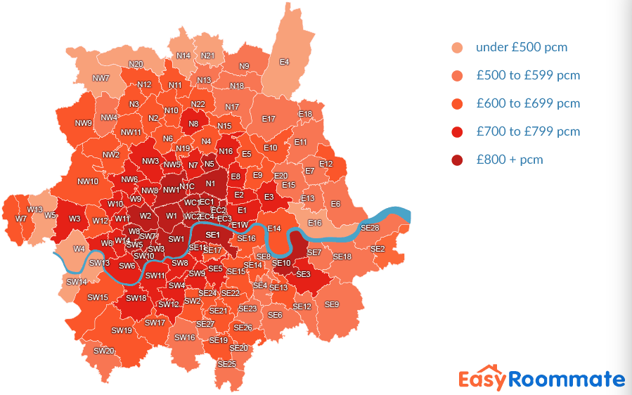 下图显示出了英国主要区域合租房成本的情况,颜色越深则表示租金成本越高: