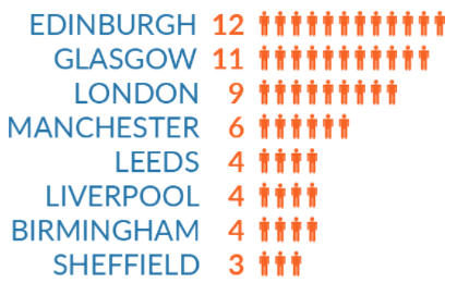 其次为格拉斯哥(11人)、伦敦(9人)以及曼彻斯特(6人)。格拉斯哥的合租房需求在近两年增长了175%之多。