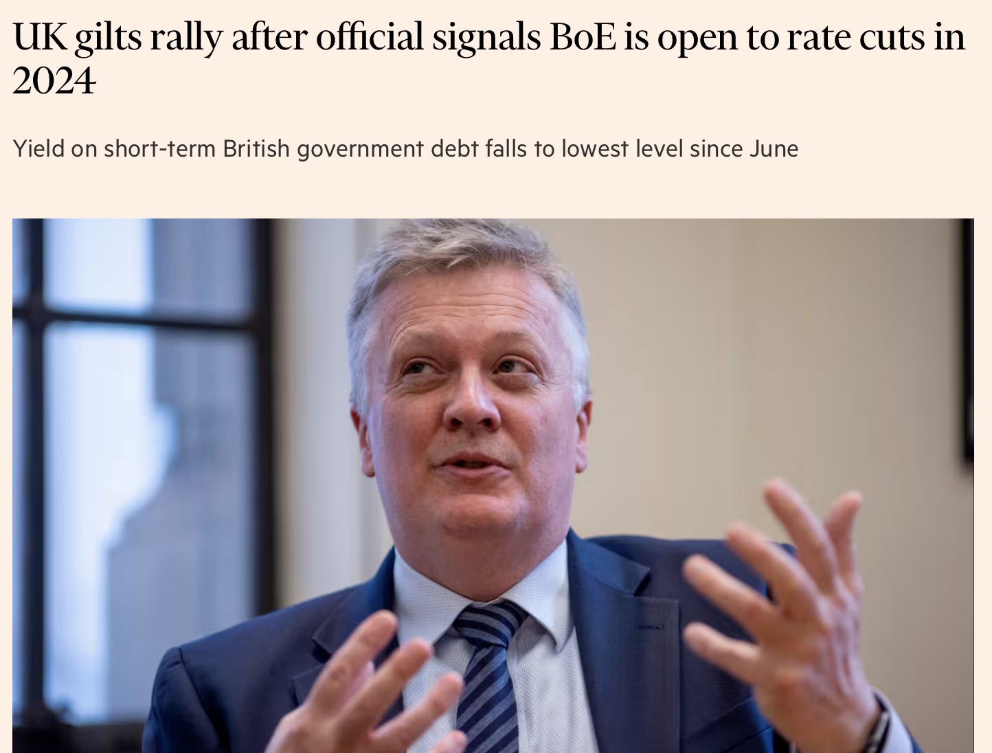 - 英国央行官员暗示或将在2024年降息,英国国债反弹。