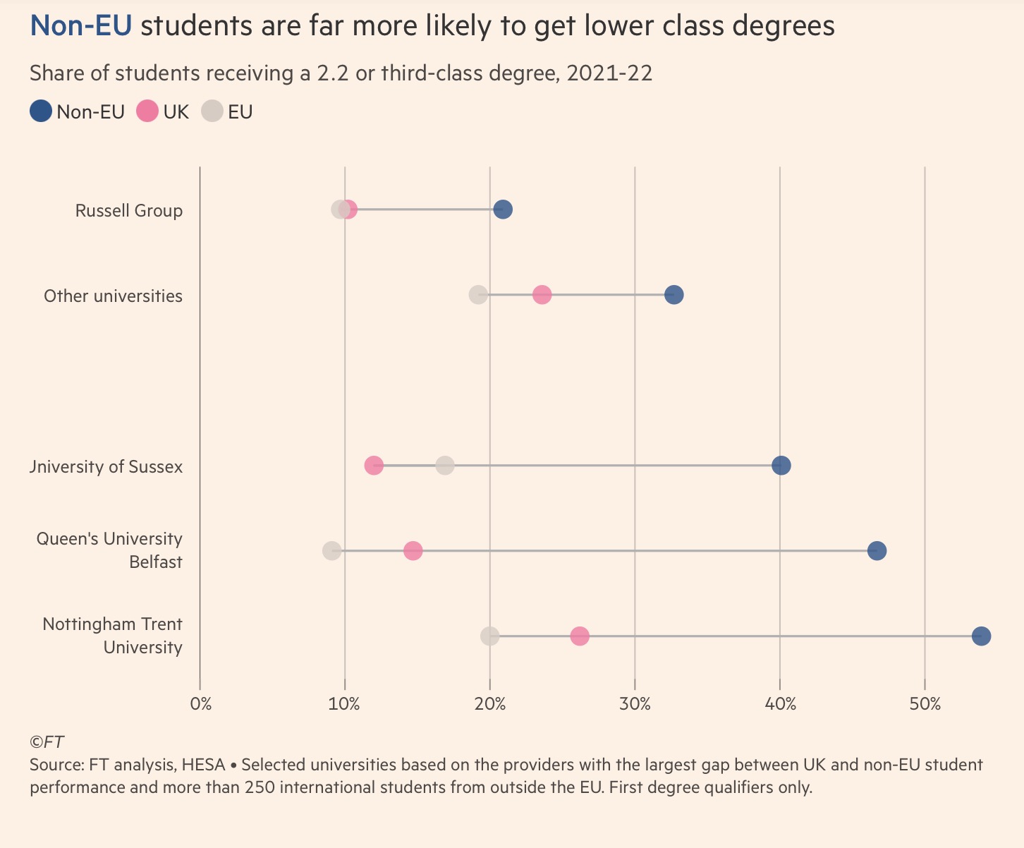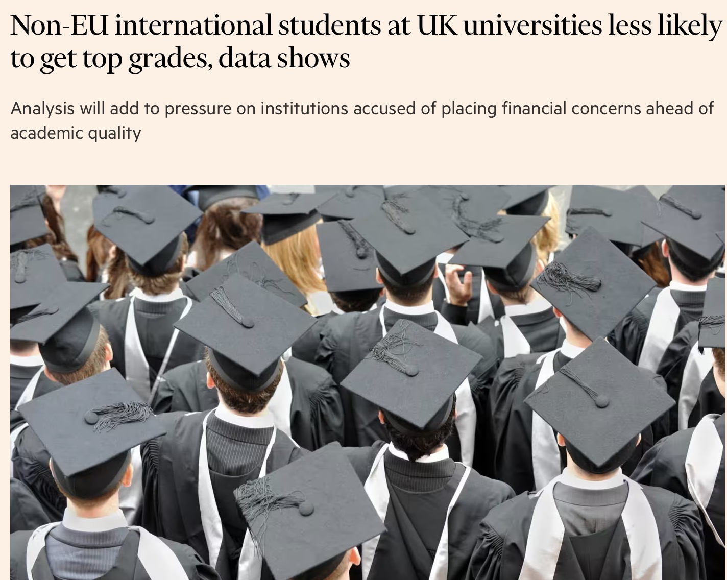 - 数据显示:英国大学的非欧盟国际学生获得高分的可能性更低。