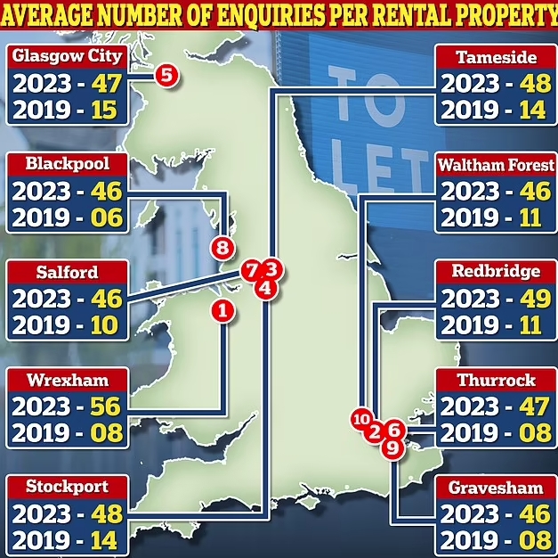 大曼彻斯特的Tameside和Stockport并列第三,2023年平均每处租赁房产的咨询量为48个。