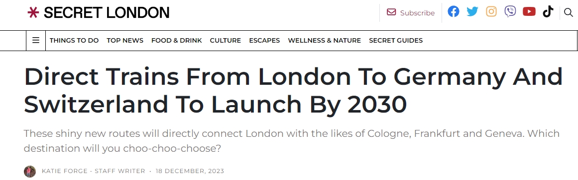 - 据Eurotunnel的所有者Getlink称,一系列从伦敦到欧洲各个城市的全新高速列车服务将在未来六年内启动并运行,预计包括科隆、法兰克福和日内瓦等城市…