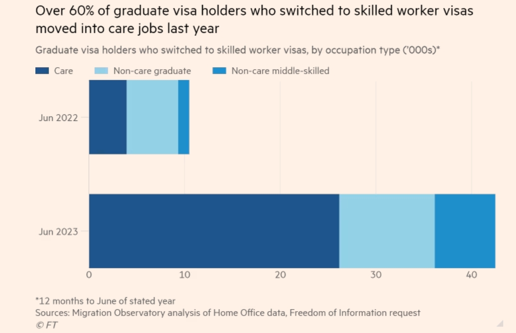 据牛津大学智库Migration Observatory think-tank的调查,截至2023年6月的一年中,从研究生签证转为技术工人签证的所有海外学生中,有一半以上从事护理工作。
