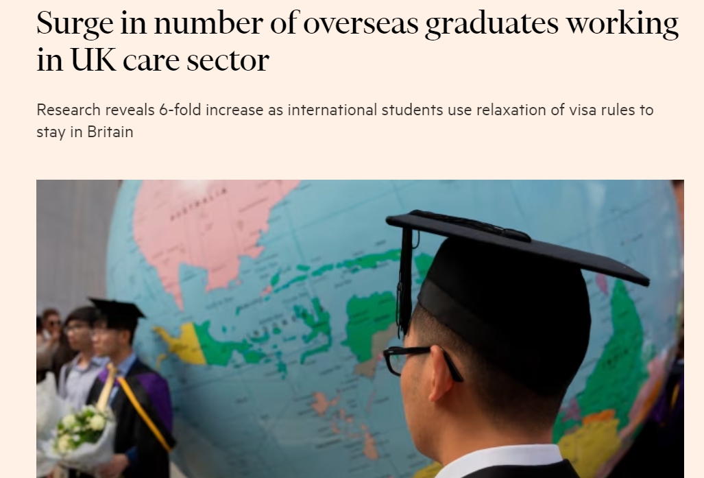 - 研究显示,随着国际学生利用放宽后的签证规则,去年留在英国从事护理工作的海外毕业生人数增加了六倍…