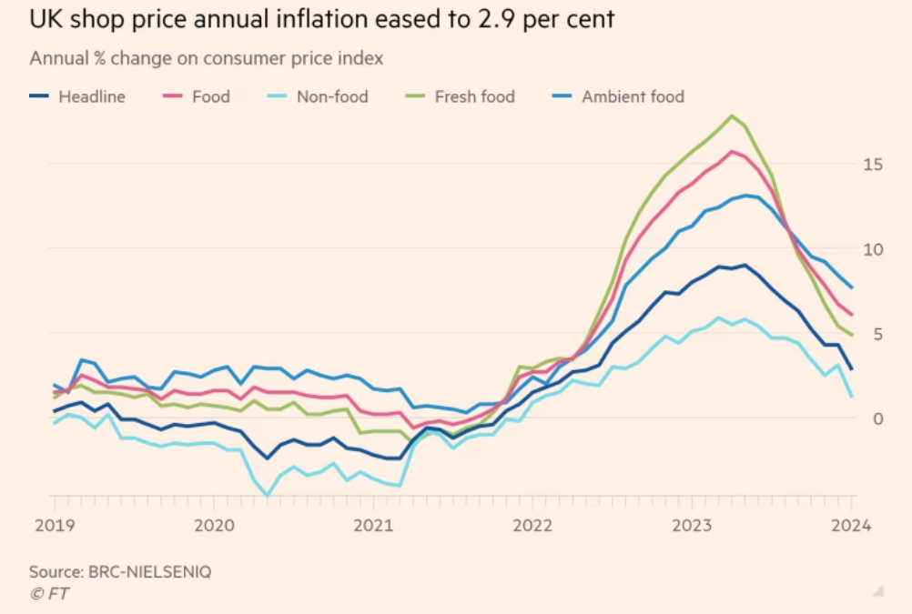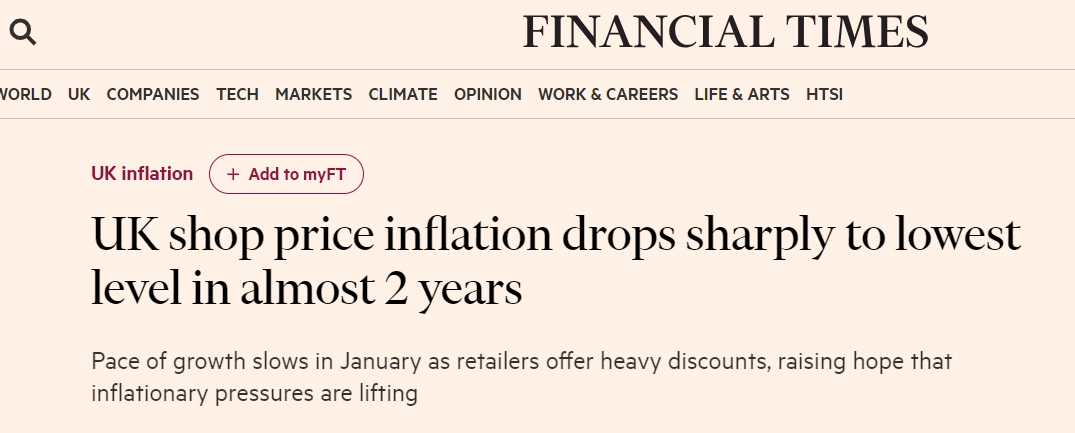 【英国商店商品价格通胀大幅下降】