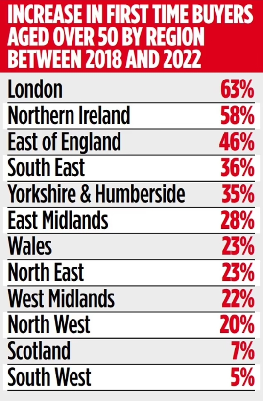 在50岁以上的首次购房者中,伦敦的人数增长最为显着,五年期间增长了63%。其次是北爱尔兰(58%)、英格兰东部(46%)和英格兰东南部(36%)。