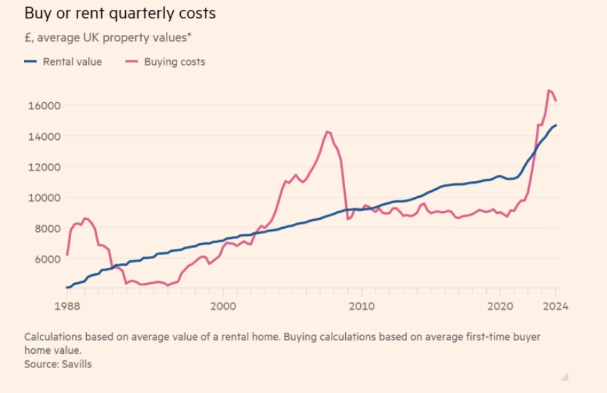 Savills的研究总监Lucian Cook解释道:“当购房成本与租房成本之间存在巨大差距时,这通常表明房地产市场估值过高。这种情况在1990年代初,或者2006-07年曾出现过。”