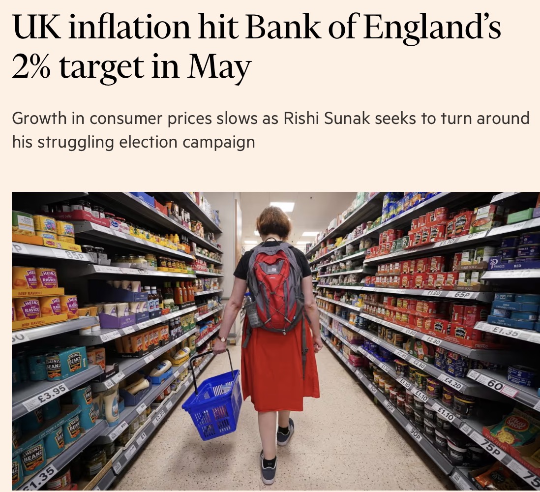 - 据金融时报报道,数据显示:5月,英国通货膨胀率近三年来首次降至央行2%的目标。物价上涨速度放缓,加大了未来几个月降息的可能性。