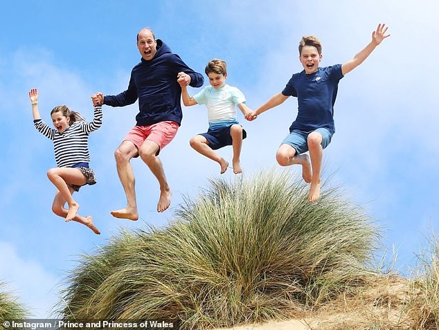 在这张照片中,威廉兴奋地和他的三个孩子一起在空中跳跃。