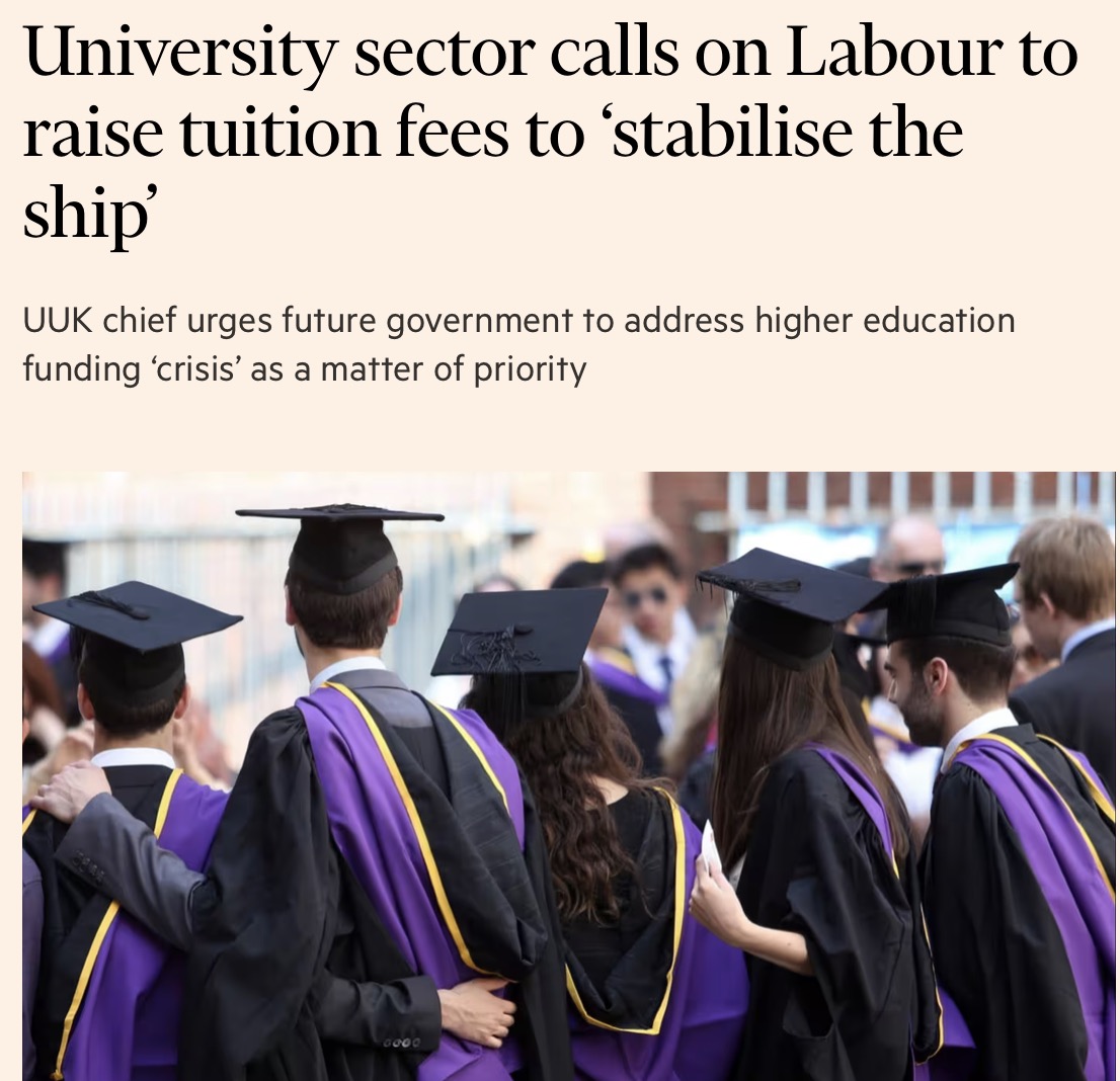 - 据金融时报报道,英国大学行业组织呼吁工党按照通胀率提高学生学费,以应对大学资金不足的困境。