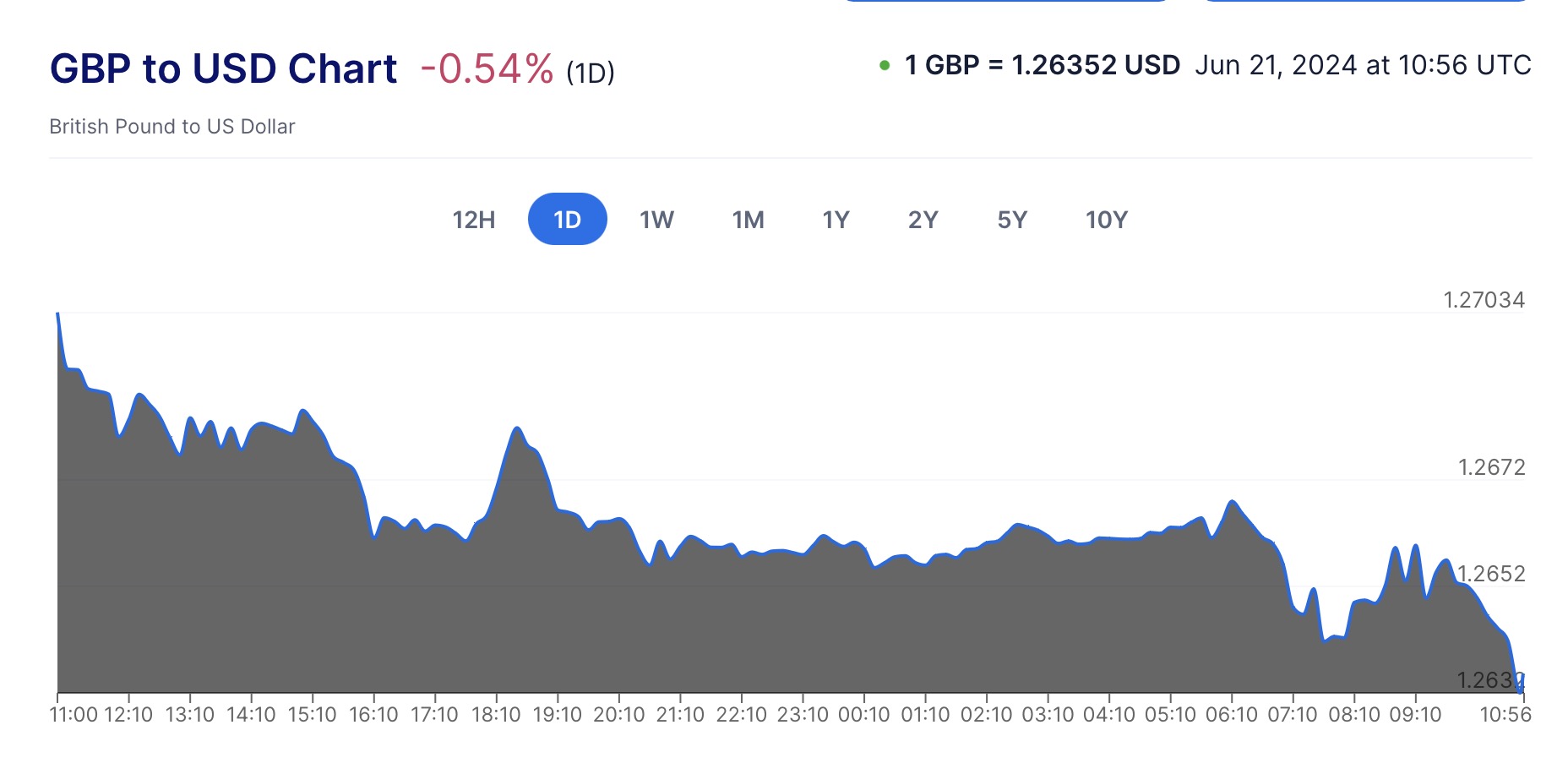 英镑兑换美元的汇率出现了下跌,目前为1 GBP = 1.26352 USD。