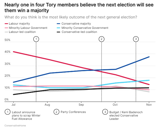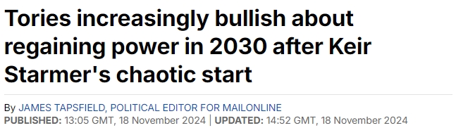 - 由于工党在上台初期并未取得预期效果,保守党对于2030年重新掌权变得越来越乐观…