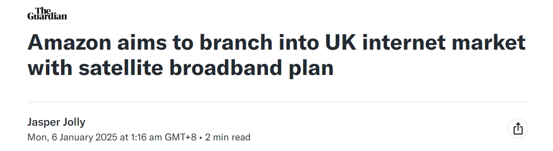 据报道,亚马逊希望未来两年内在英国提供卫星宽带服务,该公司准备发射一组航天器,最终可以将移动信号传送到最偏远的地区。
