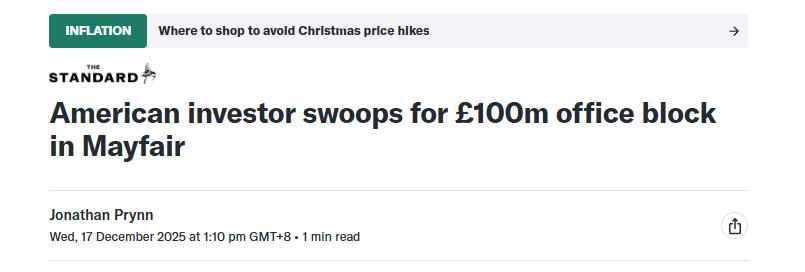 - 一位美国投资者将以约1亿英镑的价格收购位于伦敦梅菲尔区的一栋豪华写字楼…