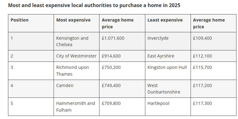 房价最低的地区是Inverclyde,平均房价为109,400英镑,肯辛顿和切尔西是其价格的10倍。