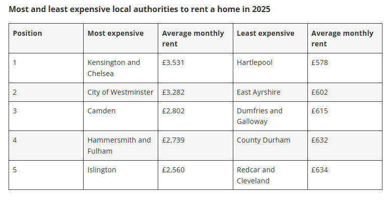 东北部的Hartlepool是2025年租房最便宜的地区,平均月租金为578英镑。紧随其后的是苏格兰的East Ayrshire(每月602英镑)和Dumfries and Galloway(每月615英镑)。