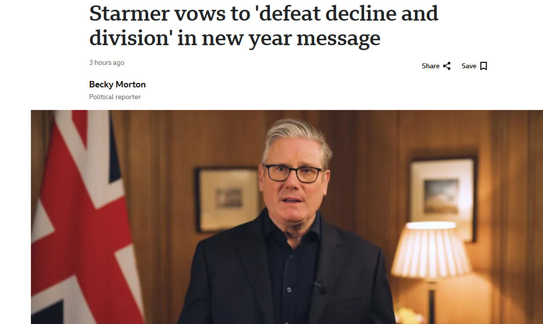 - 英国首相发表新年致辞,承诺“战胜他人带来的衰落和分裂”,并坚称2026年人们的生活将迎来“积极的改变”…