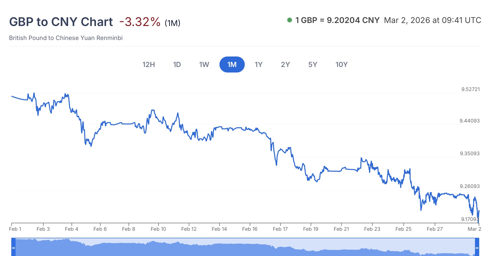 目前英镑兑换人民币汇率下降至: 1 GBP = 9.20204 CNY