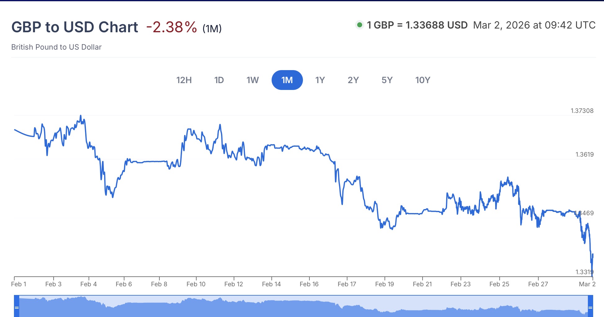 英镑兑换美元汇率为:1 GBP = 1.33688 USD